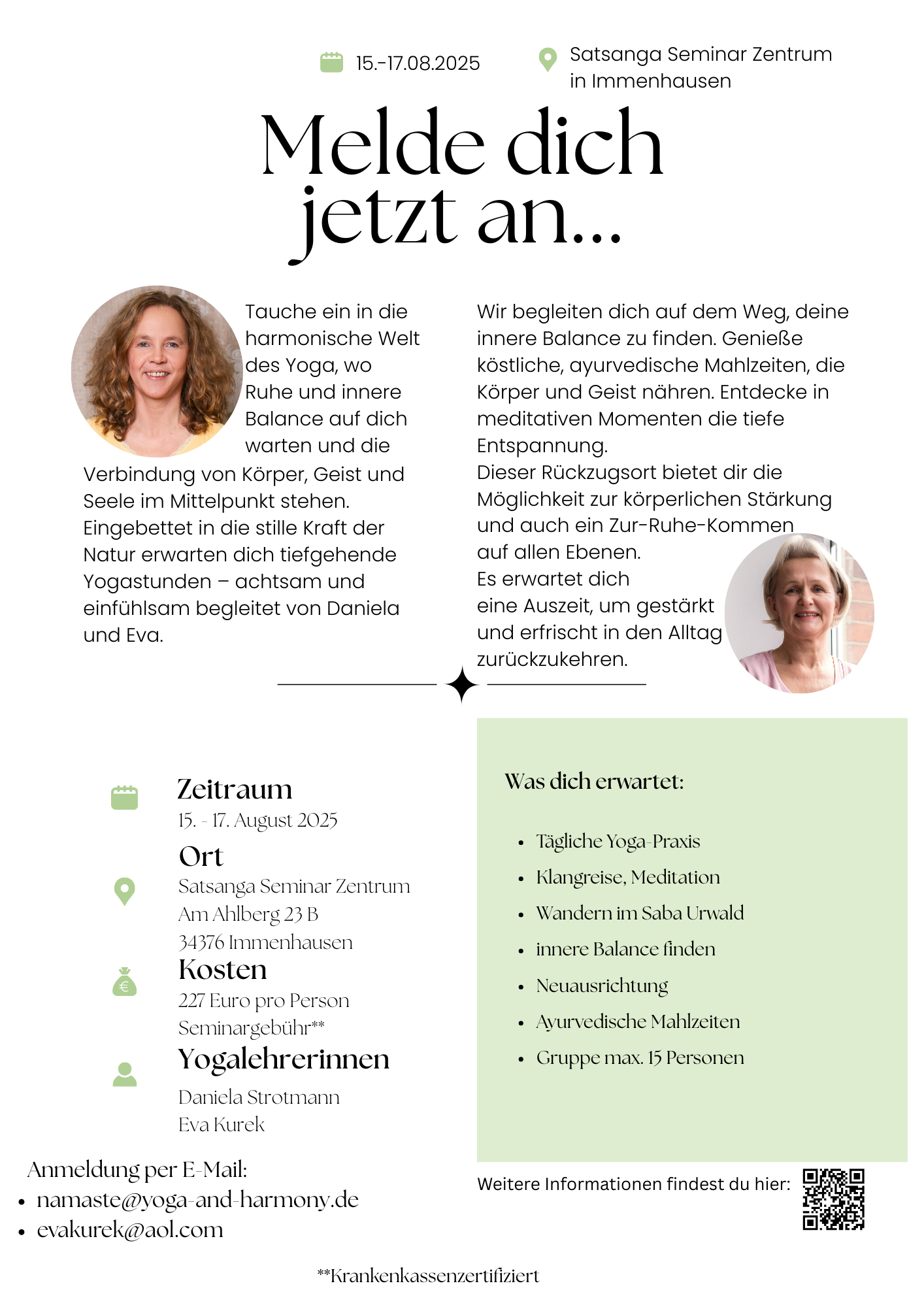Tauche ein in die harmonische Welt des Yoga, wo Ruhe und innere Balance auf dich warten und die Verbindung von Körper, Geist und Seele im Mittelpunkt stehen. Eingebettet in die stille Kraft der Natur erwarten dich tiefgehende Yogastunden – achtsam und einfühlsam begleitet von Daniela und Eva. Wir begleiten dich auf dem Weg, deine innere Balance zu finden. Dich erwarten: tägliche Yoga Praxis, Klangreise und Meditation, Wandern im Saba Urwald in einer tollen Gemeinschaft von Gleichgesinnten. Dieses Wochenende ist Krankenkassenzertifiziert sodass du die Seminargebühr einreichen kannst und somit einen Teil der Kosten bezuschusst werden.